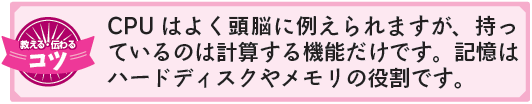 ■ハードディスクとメモリのちがい ハードディスクもメモリも記憶装置です。 パソコンの電源を切ってもハードディスクの中のデータは残るのに対し、メモリの中のデータは消えてしまうという特長があります。 パソコンでの作業は一時的…