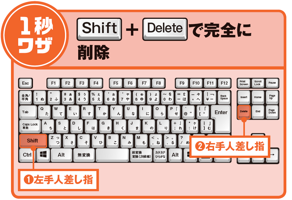 不要になったファイルを削除するには、ファイルをごみ箱にドラッグする方法、ファイルを右クリックして[削除]をクリックする方法などがある。 しかし、もっとも手軽でかんたんなのは、ファイルを選択して[Delete]キーを押す…