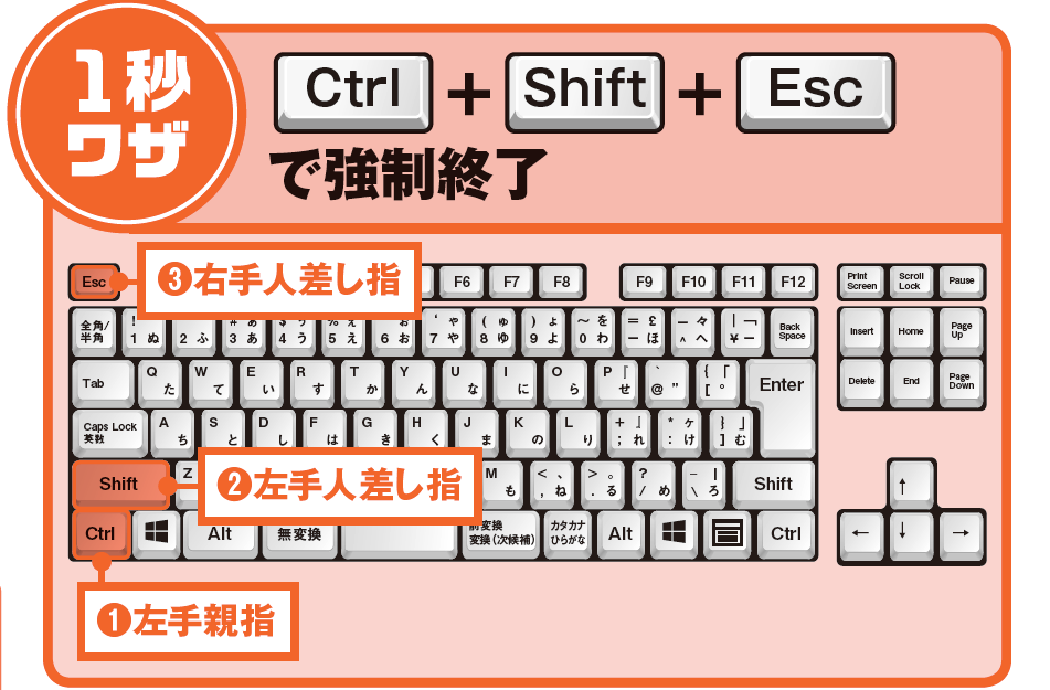 パソコンを長く利用していると、稀にカーソルがまったく動かなくなることがある。 フリーズ、または固まると呼ばれる現象だ。カーソルが動かないので、マウスは使用できない。 そんな時には、[Ctrl]+[Shift]+[Esc]…