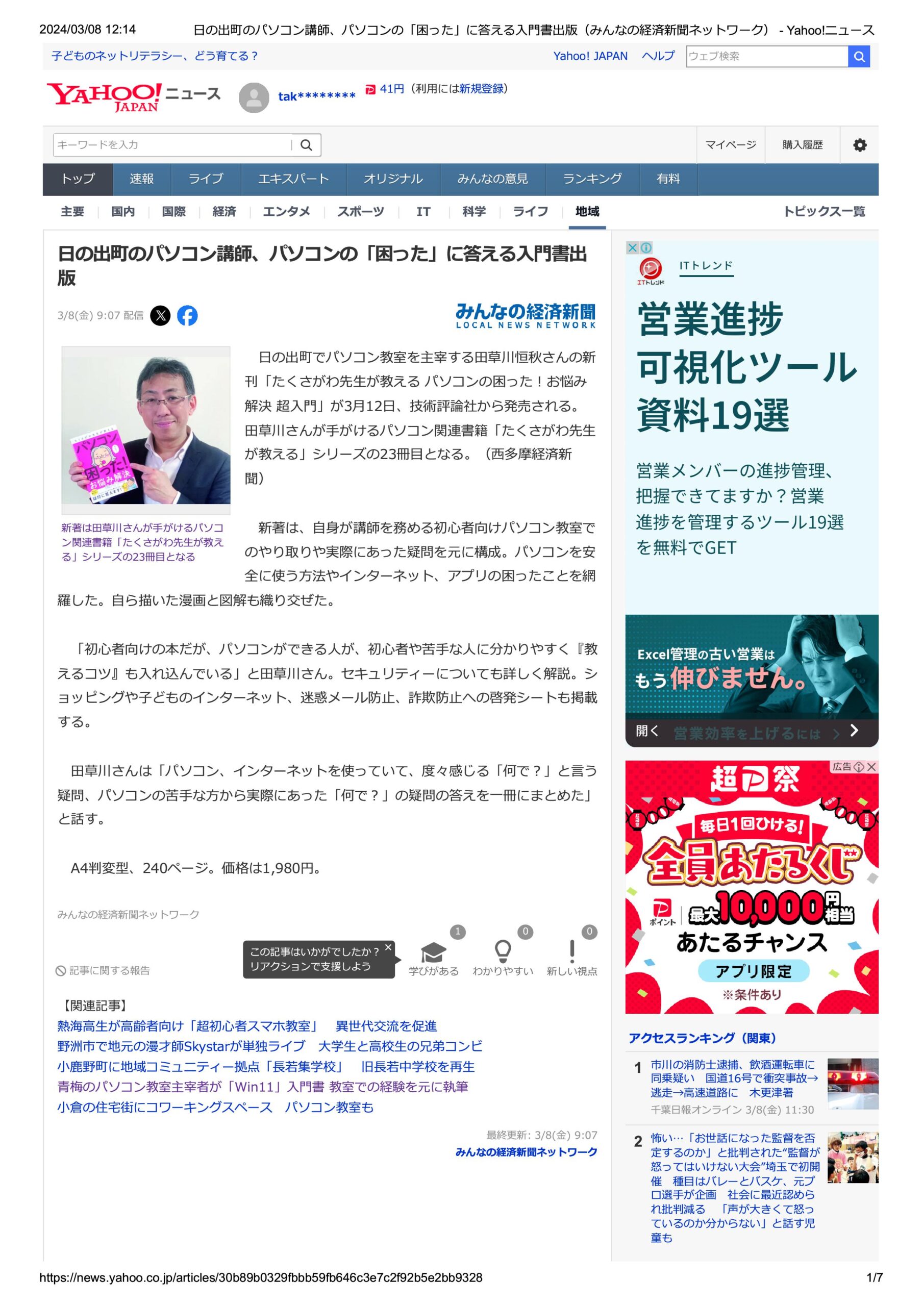日の出町でパソコン教室を主宰する田草川恒秋さんの新刊「たくさがわ先生が教える パソコンの困った!お悩み解決 超入門」が3月12日、技術評論社から発売される。田草川さんが手がけるパソコン関連書籍「たくさがわ先生が教える」シ…