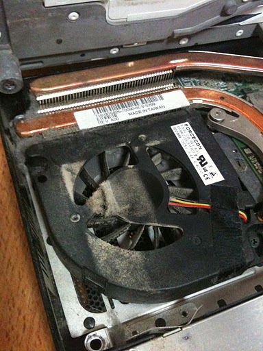 起動後1時間程で電源が落ちてしまう症状を改善すべく、 パソコンを分解し中を見てみました。 ファンの中にはびっちりと穴をふさぐように埃が詰まっていました。 これでは熱気を閉じ込めたままになってしまうので熱暴走を起こし 電源…