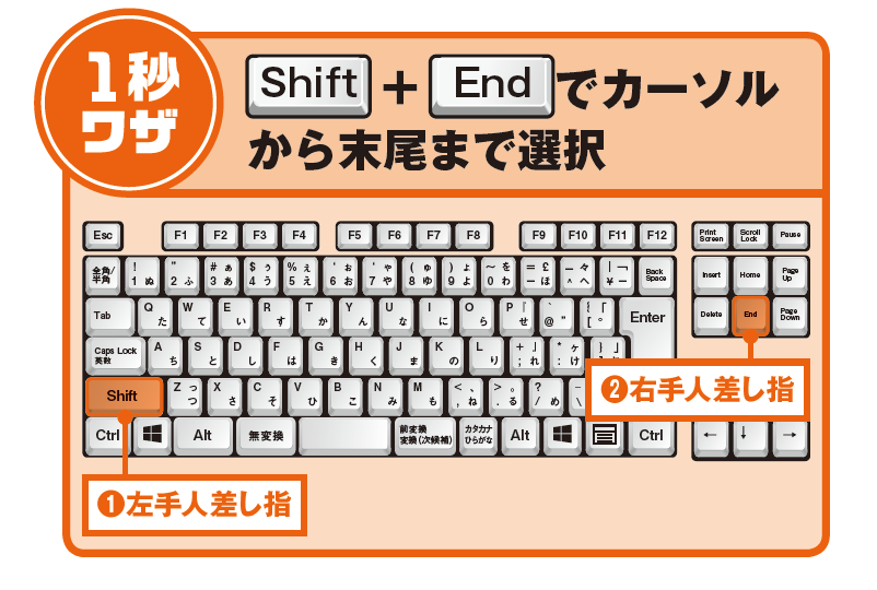 カーソルから行の末尾までを一瞬で 選択するby たくさがわ先生2014年6月21日文字選択の方法には、他にも、ワードで文章の左側にマウスカーソルを移動してクリックすることで、一行丸ごと選択できる便 利なワザもある。しかし、入力の最中に キーから指を離してマウスを動かすの は、どうしても効率が悪い。そこ…