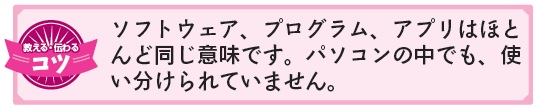 ■ソフトウェア ・プログラム・アプリ ソフトウェア、プログラム、アプリは、いずれもワードやエクエルのことを指す言葉で、ほぼ同じ意味になります。 ハードウェアに対してソフトウェアがあり、ソフトウェアには基本ソフト(OSのこ…
