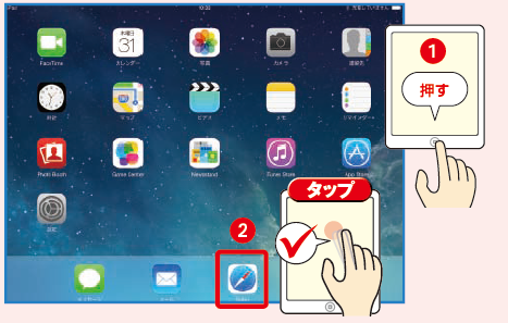 iPadに標準で搭載されているブラウザのSafariはパソコンのブラウザとほぼ同様にホームページの閲覧が可能です。 Safariを起動する ①iPadの[ホーム]ボタンを押してホーム画面を表示します。Safariのアイコ…