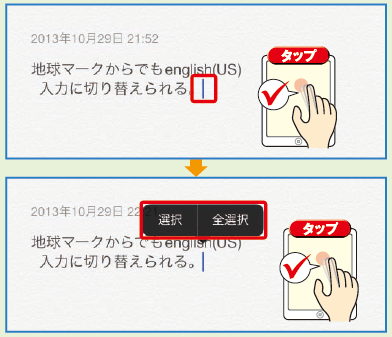 基本的な入力ができるようになったら、入力に便利な機能(コピー&貼り付け)をマスターして、効率をアップしましょう。 コピー&貼り付け あらかじめ文字を入力しておきます。 コピーしたい文章の末尾をタップ しカーソルを…