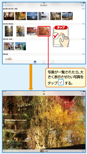 iPadでは写真を撮影、確認するだけでなく、印刷やパソコンと同期することができます。またパソコンやデジカメで撮影したものをiPadに取り込み確認するととてもきれいに見えるので驚きます。 写真を見る・印刷する 1[写真]ア…